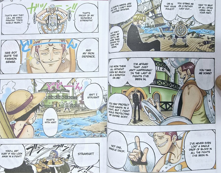 Don Krieg's evil pirate armada attempts to hijack the oceangoing restaurant Baratie, but the pirate cooks put up a fierce resistance until Krieg reveals one of the greatest secret weapons in his arsenal--Invincible Pearl! When sous chef Sanji steps into the fray, it turns out that he and Chef Zeff have some unfinished business concerning the loss of the latter's leg! Will their differences come between them or make the Baratie stronger? Either way, unfortunately for Luffy, it turns out that Don Krieg harbors an even deadlier weapon--Gin, the very man whose life Sanji once saved with a square meal!